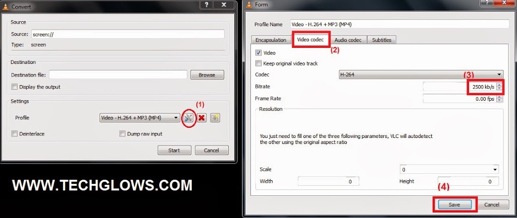 6.Then click on settings icon and new a dialog opens.Select video codec tab and set the bitrate 2500 kb/s and click on save.